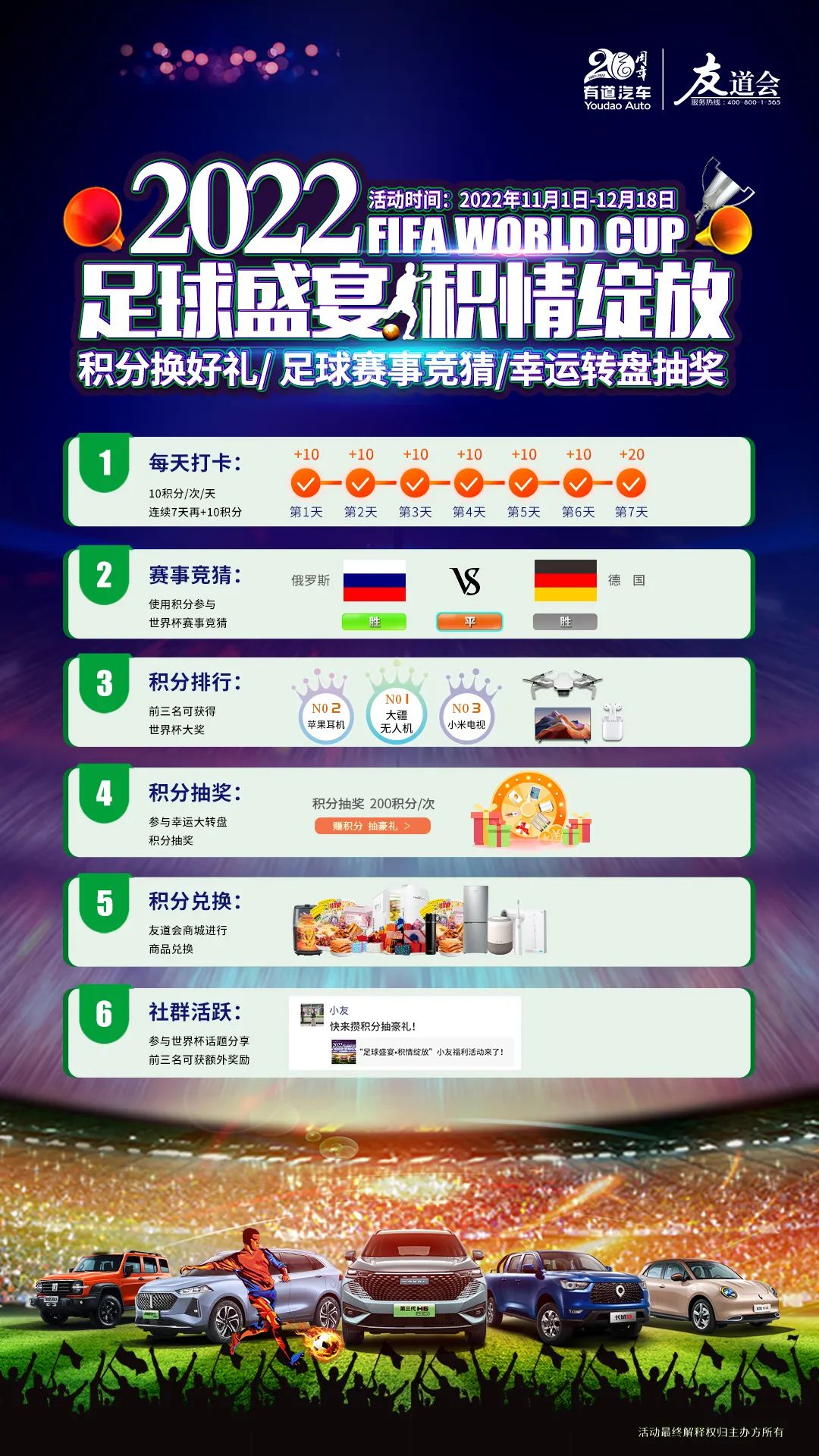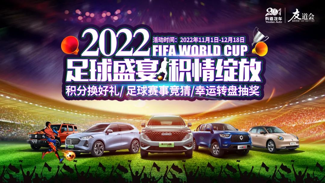 2022年11月20日-12月18日期間,到有道品牌門店試駕或保養(yǎng)愛車,即可參與“足球盛宴?積情綻放”小友福利活動。