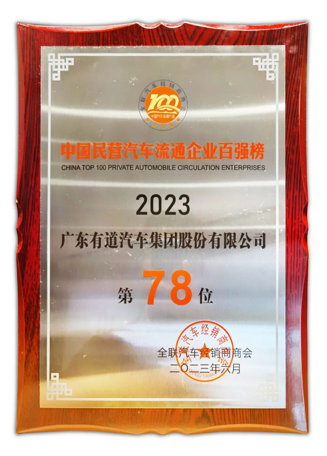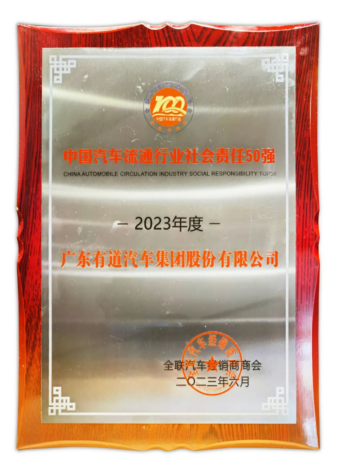 會上,全國工商業(yè)聯(lián)合會汽車經(jīng)銷商商會發(fā)布了“2023中國汽車流通行業(yè)百強榜”,有道汽車集團(tuán)以422068萬元的營收總額,榮登“中國民營汽車流通企業(yè)百強榜”第78位,并榮獲“2023中國汽車流通行業(yè)社會責(zé)任50強榜單”的稱號。