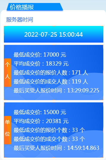 個(gè)人最低成交價(jià)為17000元,最低成交價(jià)成交人數(shù)為119人,個(gè)人平均價(jià)格為18329元/人;單位最低成交價(jià)為15000元,最低成交價(jià)成交個(gè)數(shù)為33個(gè),單位平均價(jià)格為20381元/人!