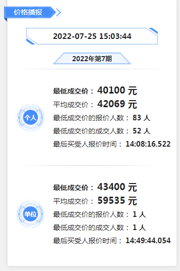 個(gè)人最低成交價(jià)為40100元,最低成交價(jià)成交人數(shù)為52人,個(gè)人平均價(jià)格為42069元/人;單位最低成交價(jià)為43400元,最低成交價(jià)成交個(gè)數(shù)為1個(gè),單位平均價(jià)格為59535元!
